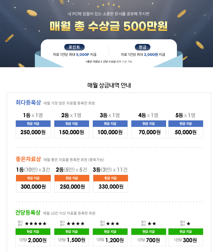 매월 총 상금 500만원으로 최다등록상, 좋은자료상, 건당등록상 상금이 지급되고 있습니다.